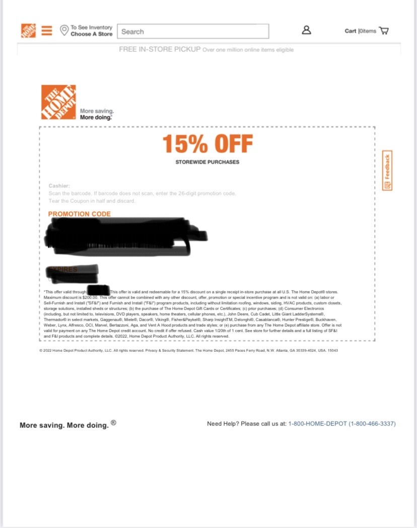 Home Depot Coupon & Promo Codes: 15% Off | October 2022 The Home Depot promo codes & discounts 2022 The Home Depot coupons & sales Discount Ends $50 Off sitewide Home Depot Coupon 2022 $50 Dec 31 Save up to 50% at Home Depot Special Buy Savings 50% Dec...
